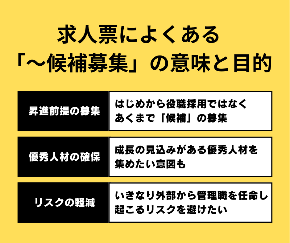 この「候補」としての採用は、いきなりの役職採用ではなく企業に深く貢献できるポテンシャルのある人材を求めていることを意味しているケースがほとんどです。