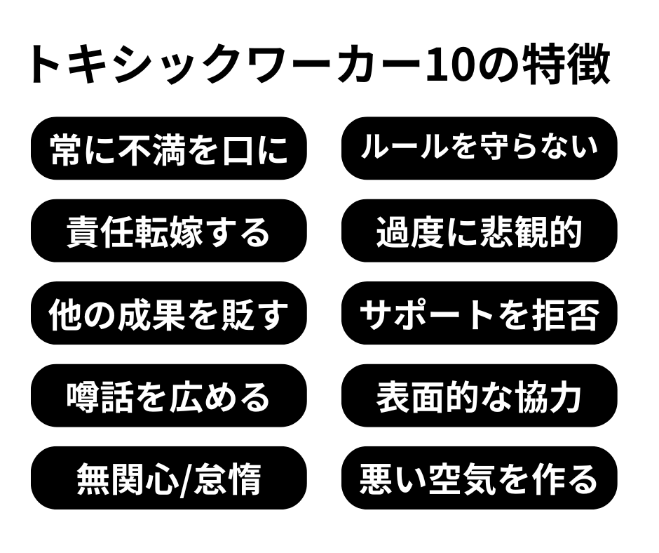 トキシックワーカー(Toxic Worker)は、職場の雰囲気を悪化させる要因を多く持つ社員です。常にネガティブで、他者のモチベーションや精神的な健康に悪影響を及ぼします。彼らの特徴として、次のようなものが挙げられます。