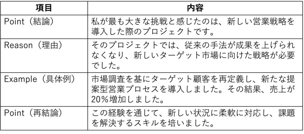 最後の「Point(再結論)」では、自信を持って結論を再確認しましょう。自分の強みや経験をしっかりと伝えることが大切です。この部分で弱気になると、面接官に不安な印象を与えてしまいます。