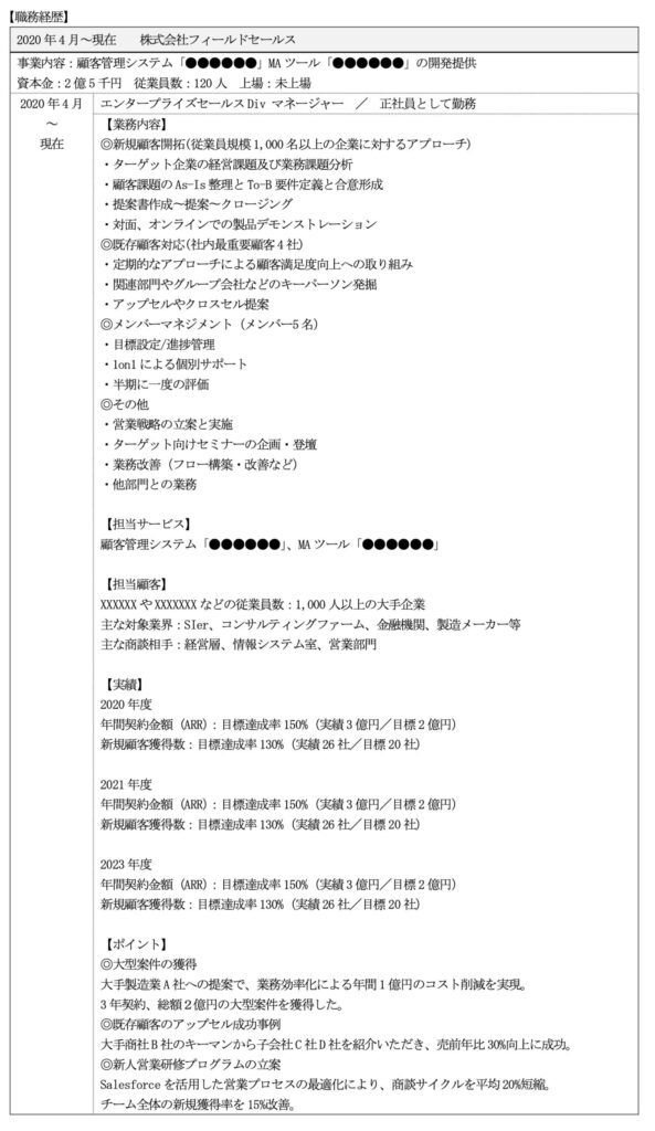 具体的なターゲット業種や顧客規模を明示することで、過去の経験がどのような領域で活かされるかが伝わりやすくなります。実際に担当していた顧客に、シンボリックな企業、大手ナショナルクライアントなどあれば社名を記載すると、選考担当が対応できる顧客レベルを想像できて効果的です。ただし、利用顧客が社外秘であったり、そうでなくても記載について気が引けるようであれば、「大手消費財メーカー(東証プライム/従業員規模XXX名)」といった書き方も有効です。