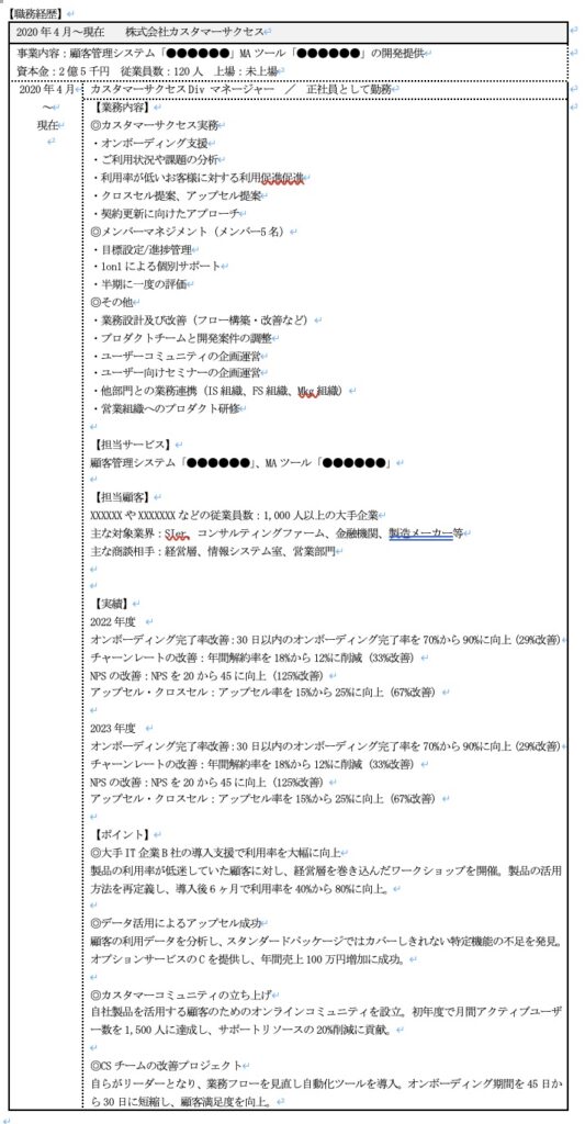 【担当サービス】も相手に自身の仕事内容を伝えるにあたって重要な要素です。複数のプロダクトを扱っているベンダーに所属していた場合、担当サービス名の記載がないと選考担当はどのサービスを担当していたのか調べたり、予測する手間が必要になるため、軽微なストレスがかかります。