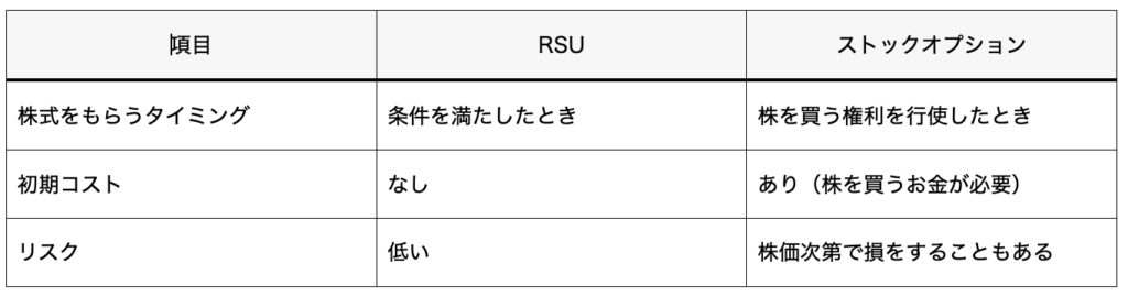 ストックオプションは、RSUと同じく「社員に報酬として株式を与える仕組み」ですが、具体的には以下のような違いがあります。