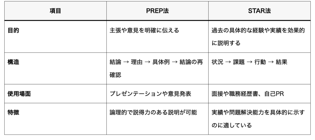 PREP法とSTAR法は、それぞれ異なる目的と構造を持っています。主な違いを以下にまとめます。