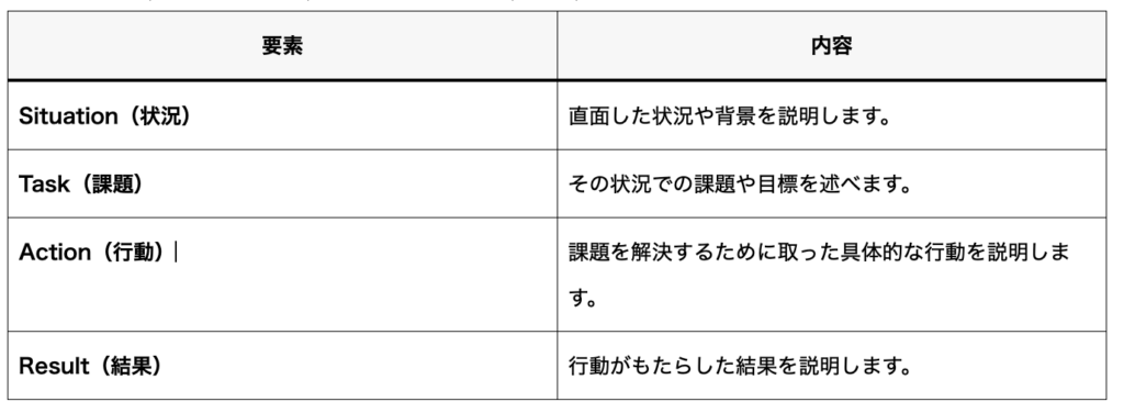 STAR法は、具体的な行動や成果を示したい場面に最適です。例えば、「あなたが直面した課題を教えてください」という質問に対して、STAR法を使うと以下のように答えられます。